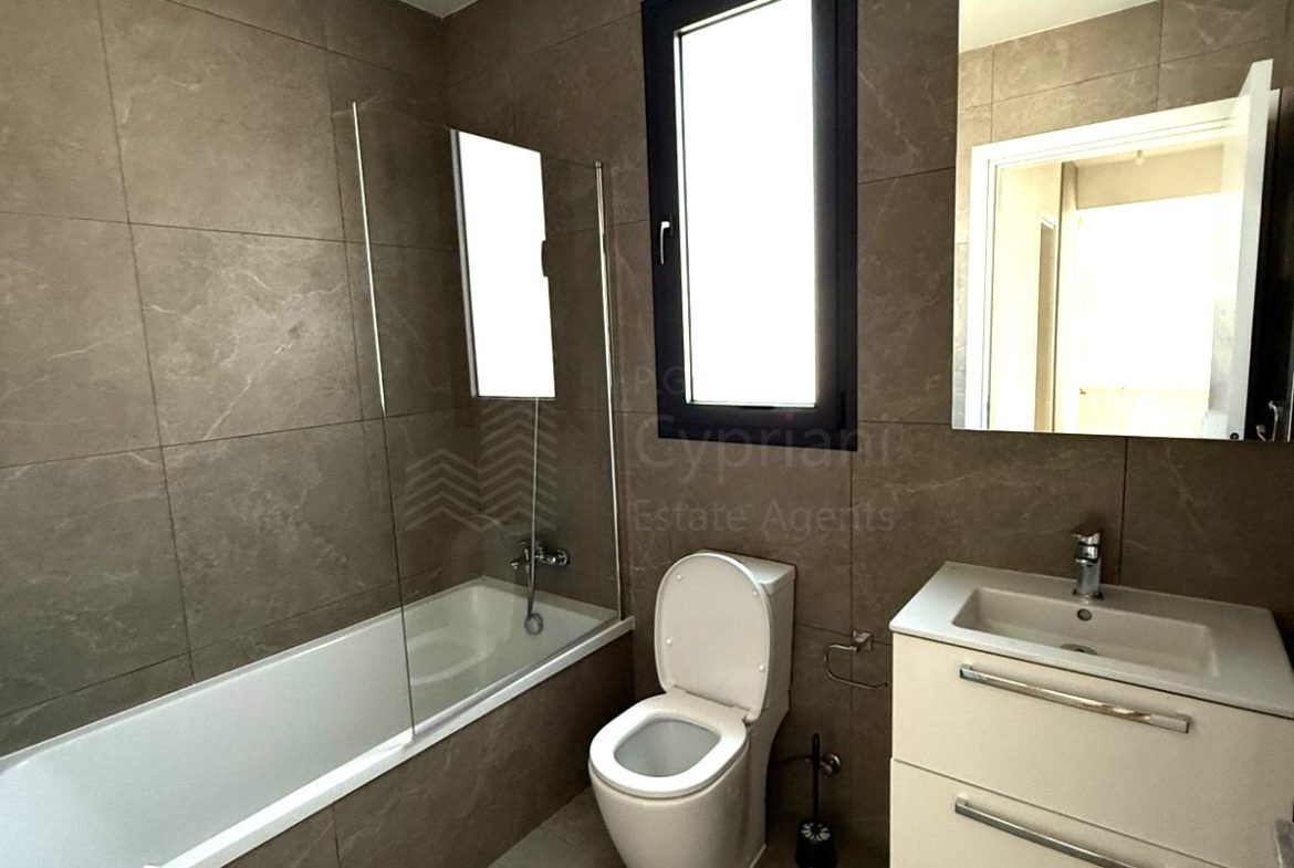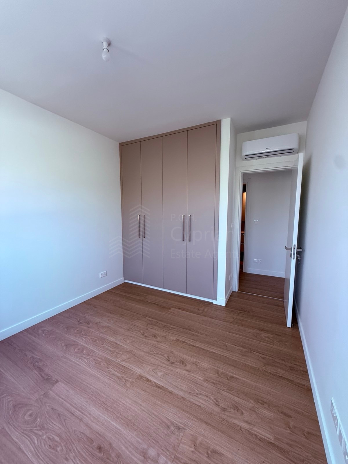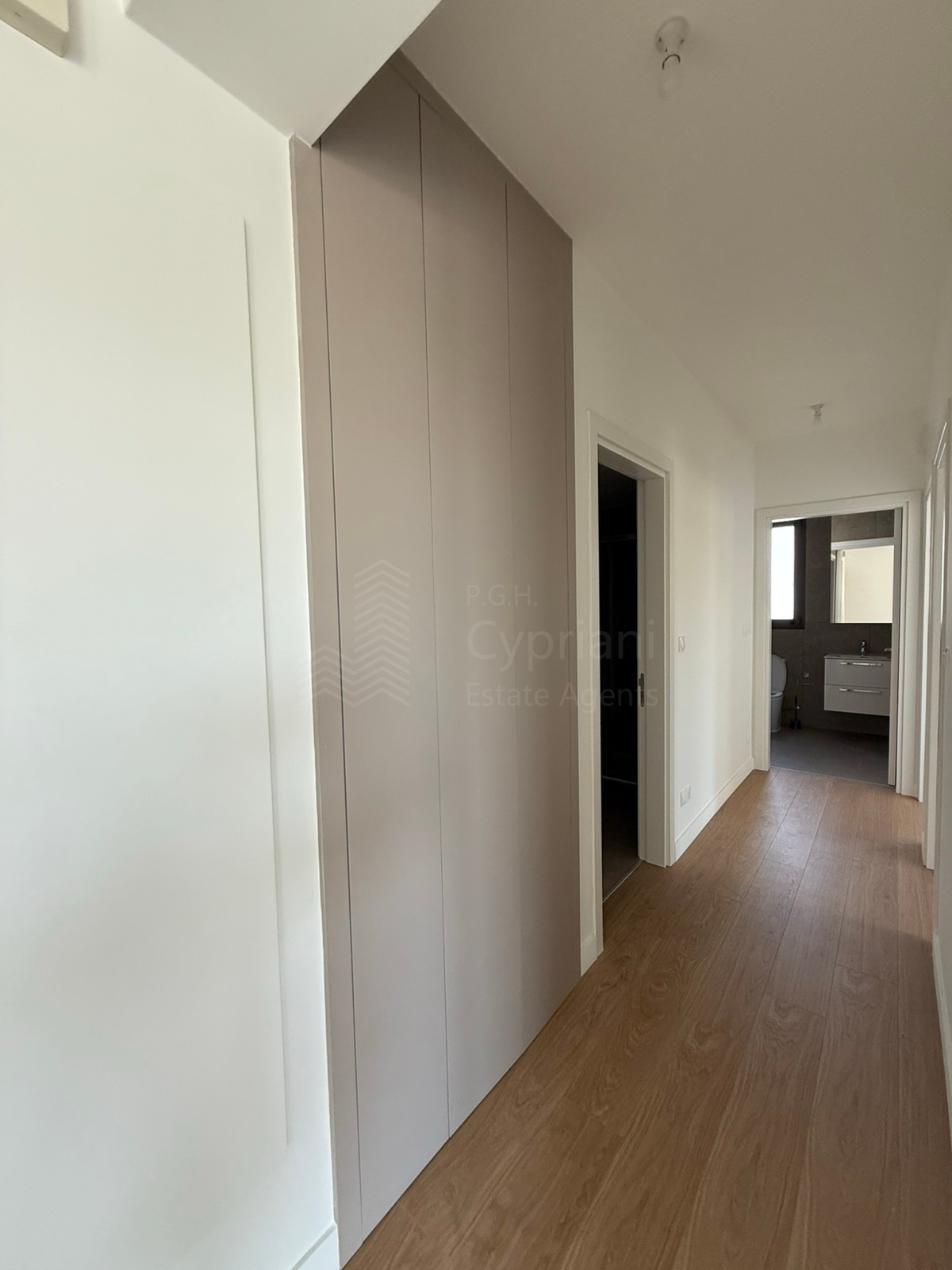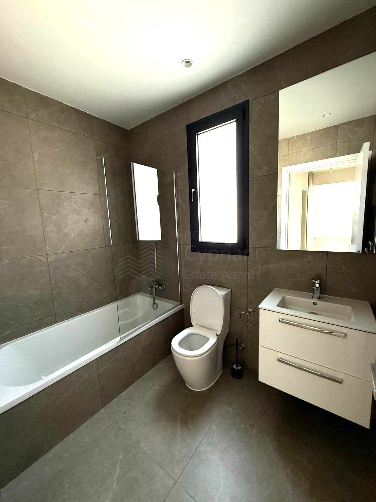 A brand new luxury two-bedroom apartment for rent in Strovolos, in a prime location near Athalassas Avenue. The apartment has an area of 86 sqm + 24 sqm covered verandas and it is set on the 1st floor. It features two bathrooms, a storage room and a covered parking space. Other features of the property include high-quality finishes, appliances, air conditioning, underfloor heating, solar panels and a solar water heater. The apartment is set in a modern luxury building that features an extra communal patio.