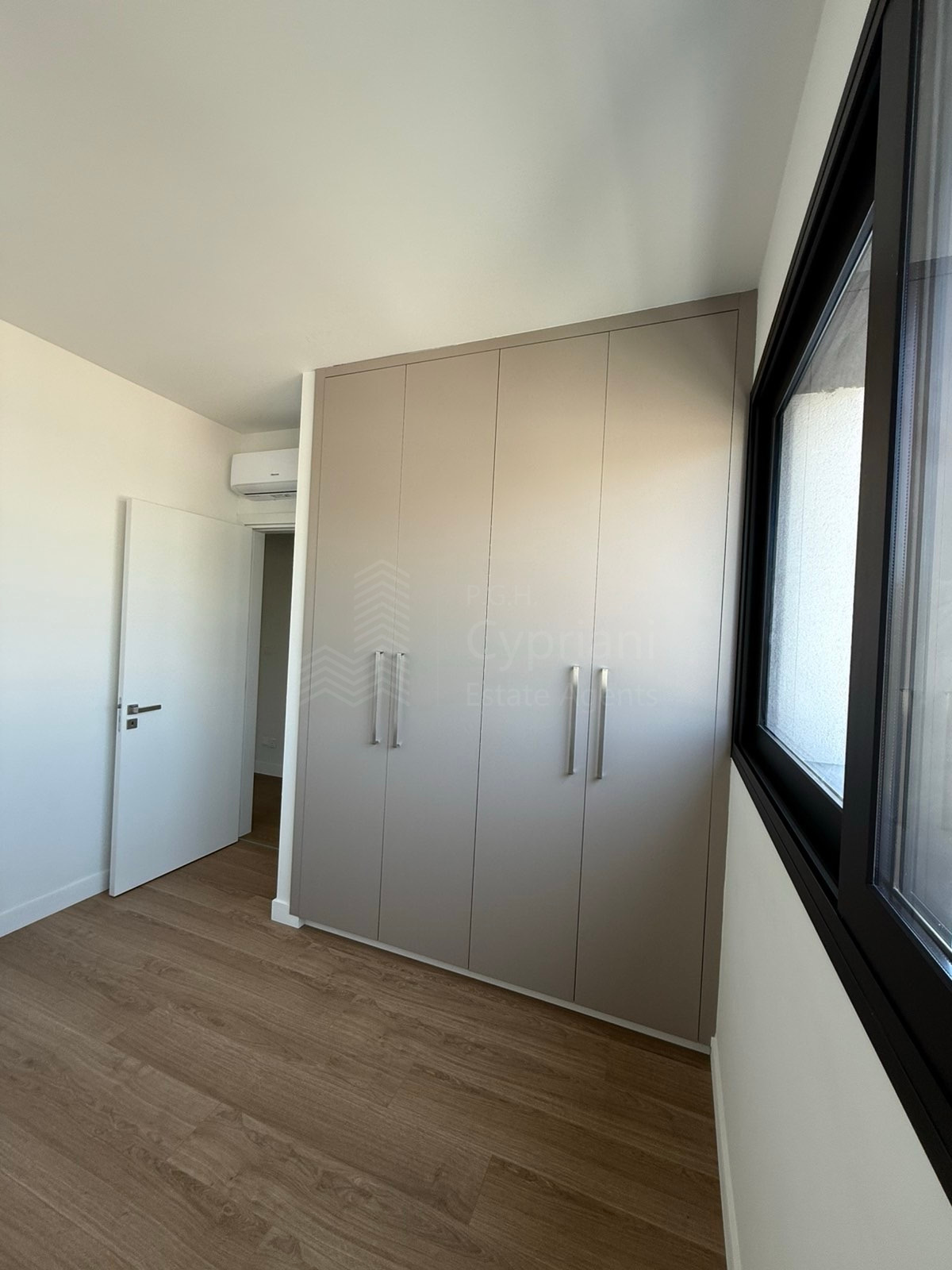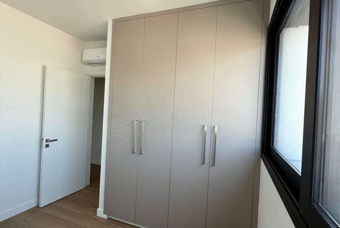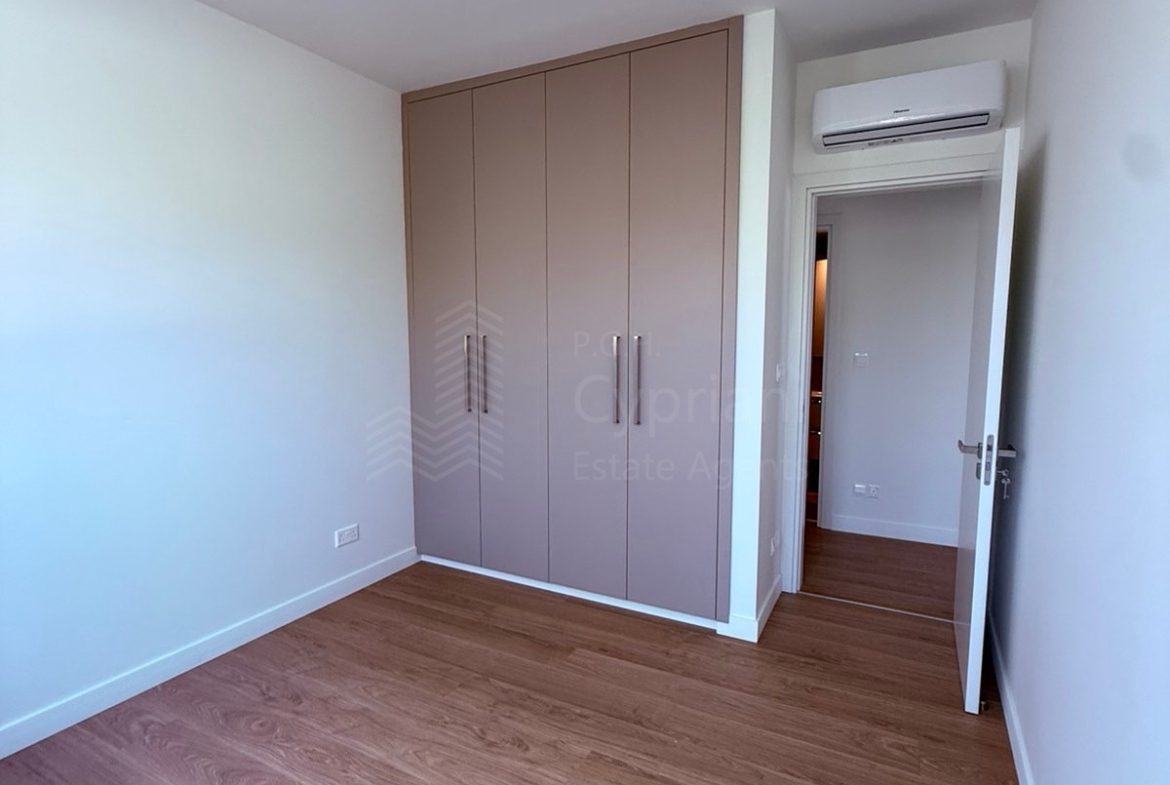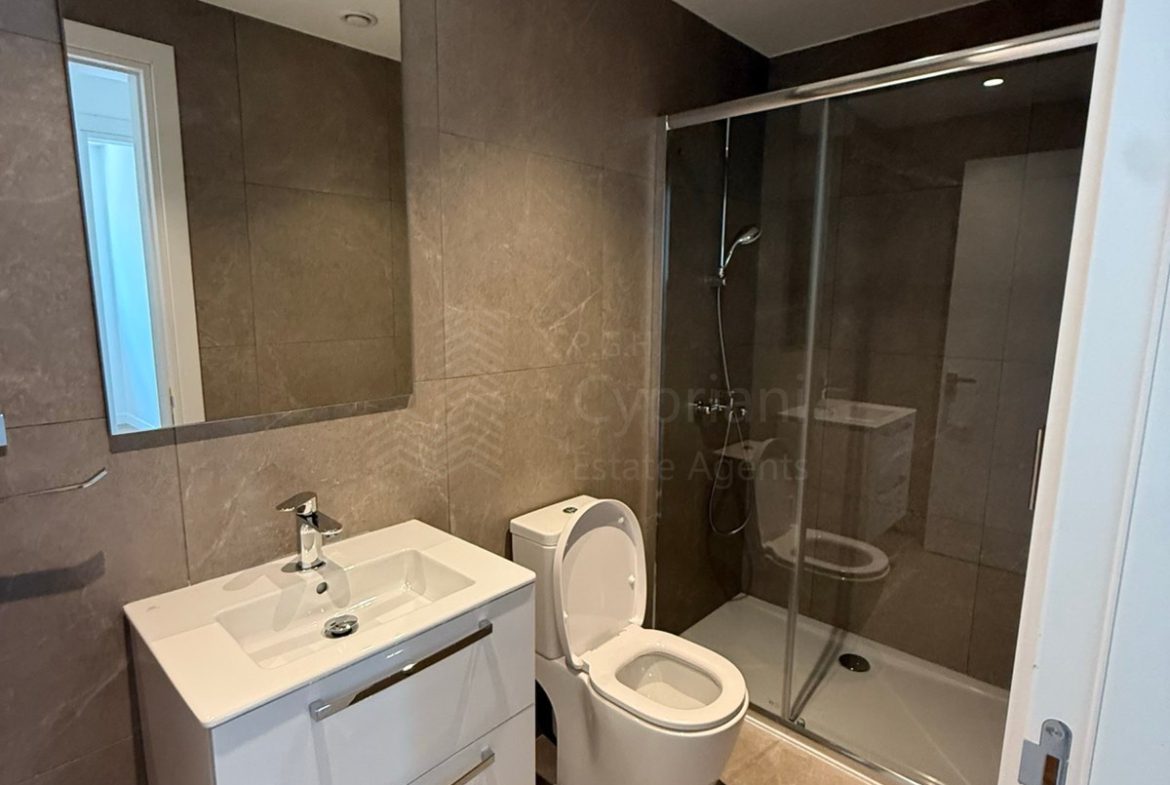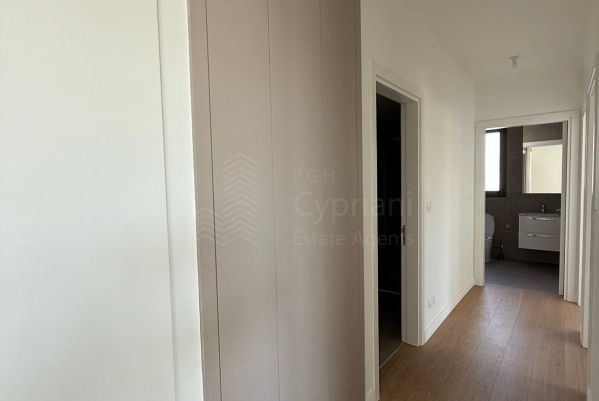 A brand new luxury two-bedroom apartment for rent in Strovolos, in a prime location near Athalassas Avenue. The apartment has an area of 86 sqm + 24 sqm covered verandas and it is set on the 1st floor. It features two bathrooms, a storage room and a covered parking space. Other features of the property include high-quality finishes, appliances, air conditioning, underfloor heating, solar panels and a solar water heater. The apartment is set in a modern luxury building that features an extra communal patio.